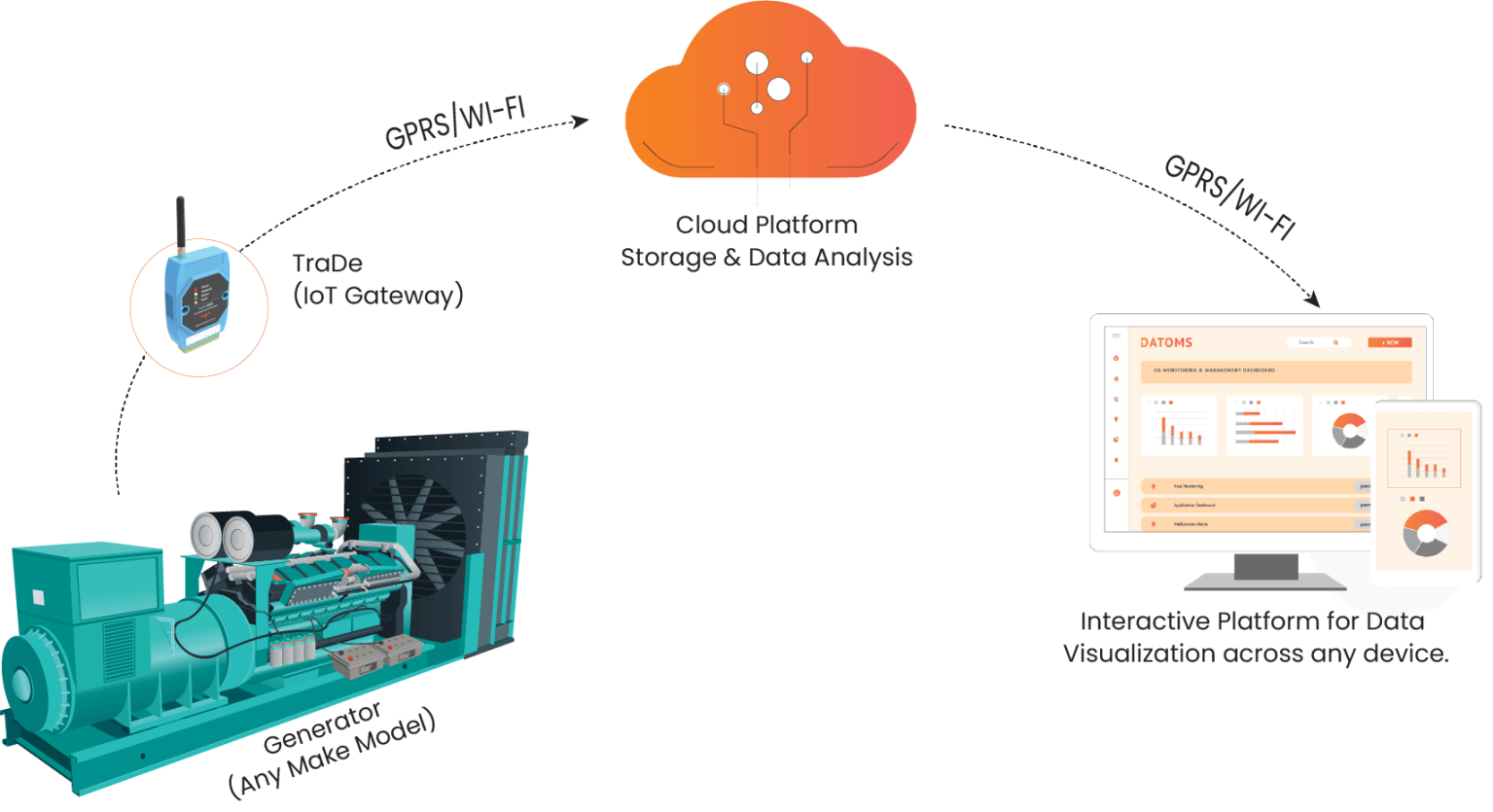 The sensors communicate with our gateway device TraDe, which captures the readings acquired by the sensors and transmits them to our IoT platform-DATOMS. These data are monitored continuously in real-time and can be viewed anywhere-anytime through user interactive web and mobile applications.